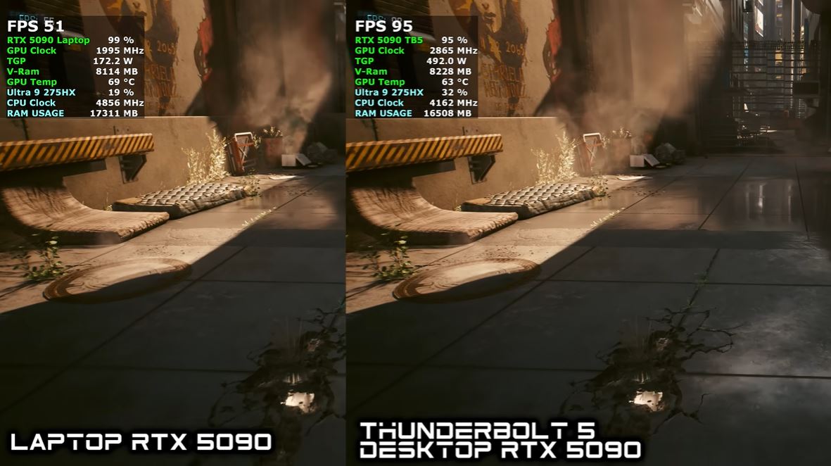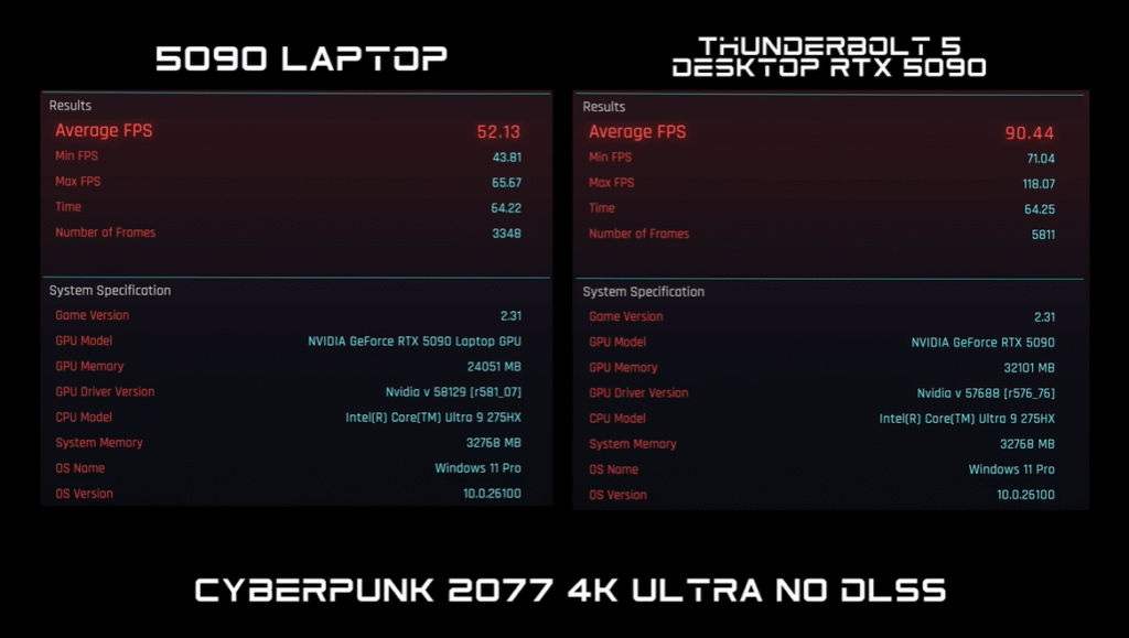 Para evaluar su rendimiento, el YouTuber ETA PRIME conectó el Razer Core X V2 a una laptop gaming (ROG Strix Scar G18) empleando una GeForce RTX 5090 externa a través del puerto Thunderbolt 5. En la prueba de Cyberpunk 2077 en 4K Ultra y sin DLSS activo, la GPU interna de la laptop arrojó 52 FPS, mientras que usando la misma tarjeta gráfica montada en el dock eGPU se obtuvo 90 FPS.