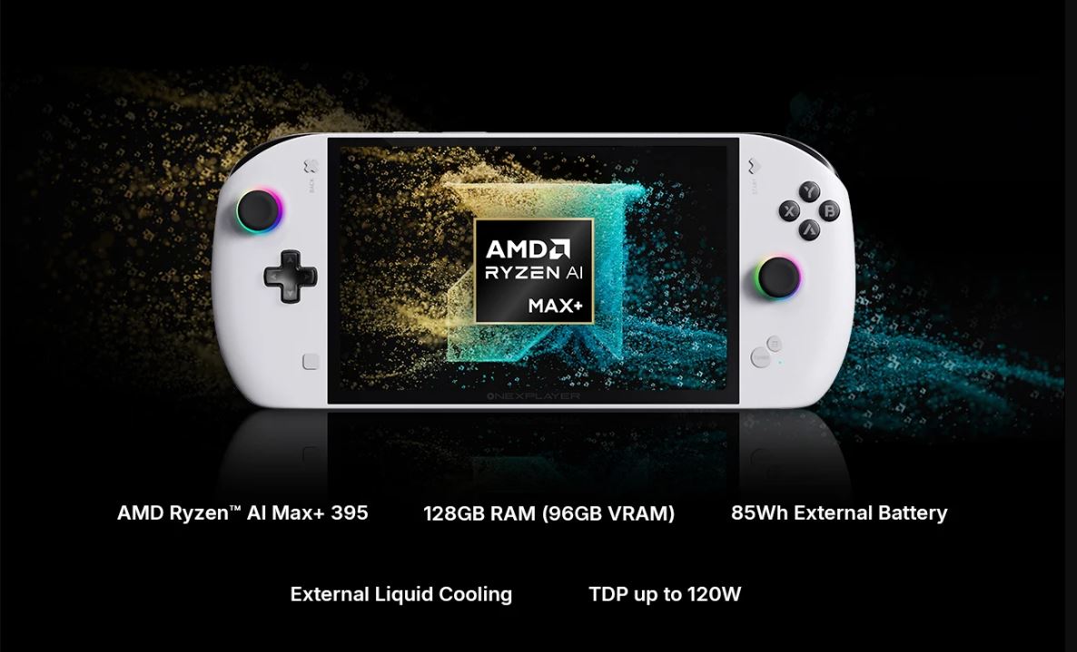 El OneXFly Apex está equipado con el procesador AMD Ryzen AI Max+ 395 (nombre código: Strix Halo), que representa la APU x86 más potente disponible actualmente. Este chip integra 16 núcleos Zen 5 con velocidades de reloj de hasta 5.1 GHz y una GPU Radeon 8060S con 40 unidades de cómputo.